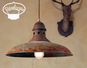 - Una lámpara de Retrolampe; de las cuales debemos hacer una especial mención a los acabados en óxido, negro fundición, cobre fundición, oro viejo y los acabados en blanco con ribete en azul y en negro.